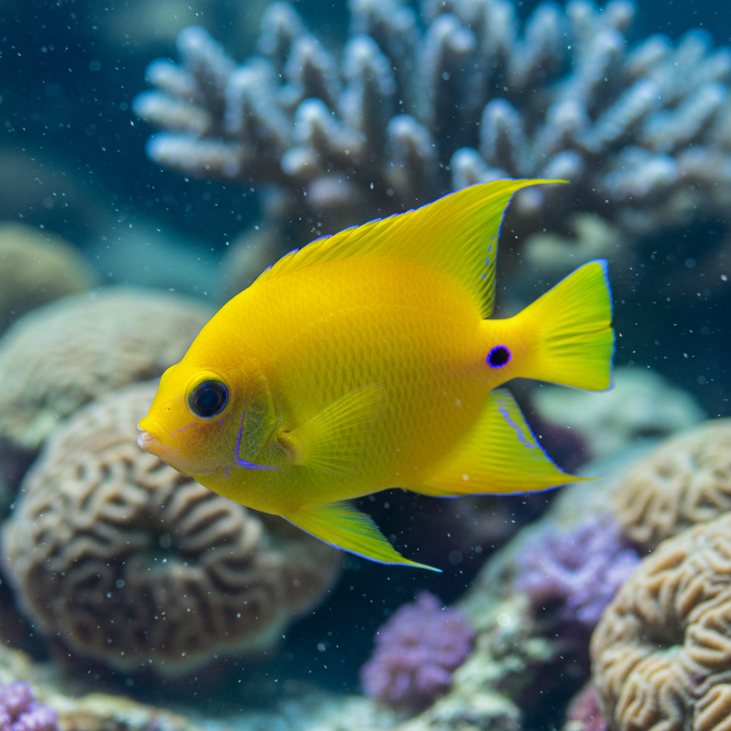 The Herald's Angelfish (Centropyge heraldi), commonly known as the Yellow Pygmy Angelfish, is a vibrant and hardy member of the dwarf angelfish group. It is defined by its striking, solid yellow coloration that covers every part of its body, including its fins. In the wild, it is often found mimicking the Herald's Blenny or the juvenile Lemonpeel Angelfish, although it can be distinguished by the absence of the blue ring around the eye and the blue gill-cover edge characteristic of the latter.