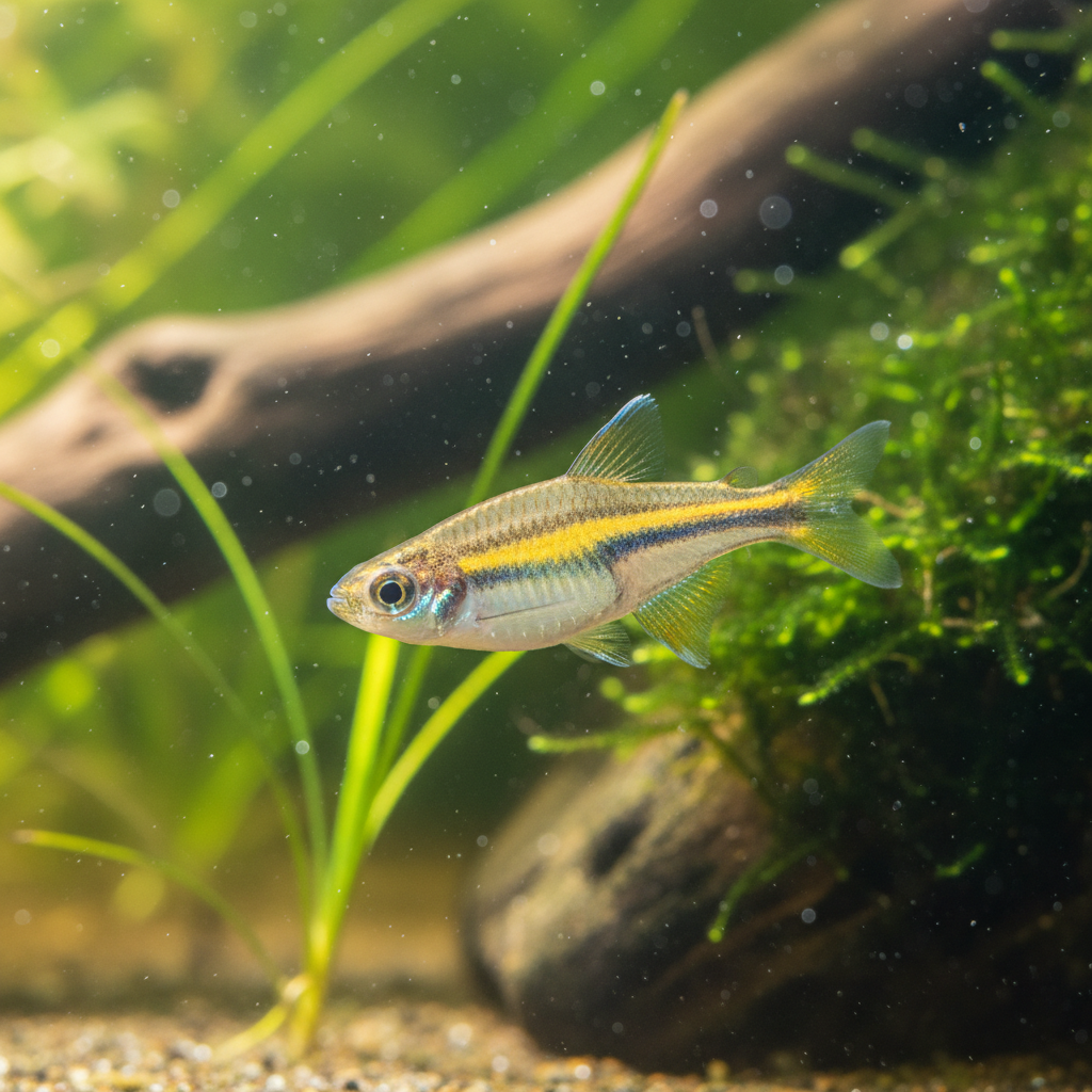 Maintain stable parameters: a pH of 6.5 to 7.5 and a slightly cooler tropical temperature of 72°F to 79°F (22°C to 26°C). They thrive in well-oxygenated water with a moderate current. The tank should be well-planted along the sides and back to provide security, while leaving a large open area in the center for their high-speed schooling "racing." A tight-fitting lid is essential, as like all danios, they are expert jumpers.