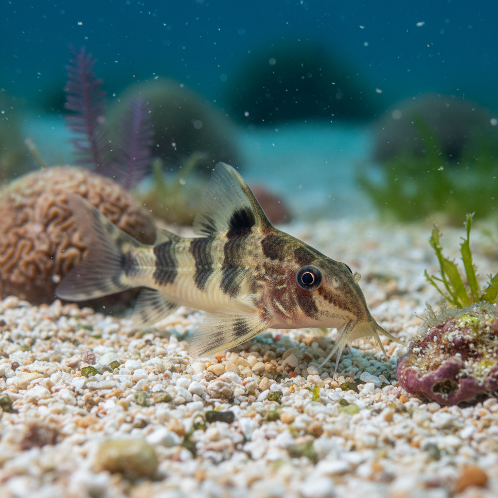 Maintain stable parameters: a pH of 5.5 to 7.0 (though lower is tolerated if stable) and a temperature of 75°F to 82°F (24°C to 28°C). The tank must feature a fine sandy substrate to protect their delicate sensory barbels. Decorate with tangle-roots (driftwood), dried botanical leaves (Indian Almond leaves, Alder cones), and low-light plants like Cryptocoryne or Anubias. The use of peat filtration or botanical extracts to maintain "blackwater" conditions is highly recommended.