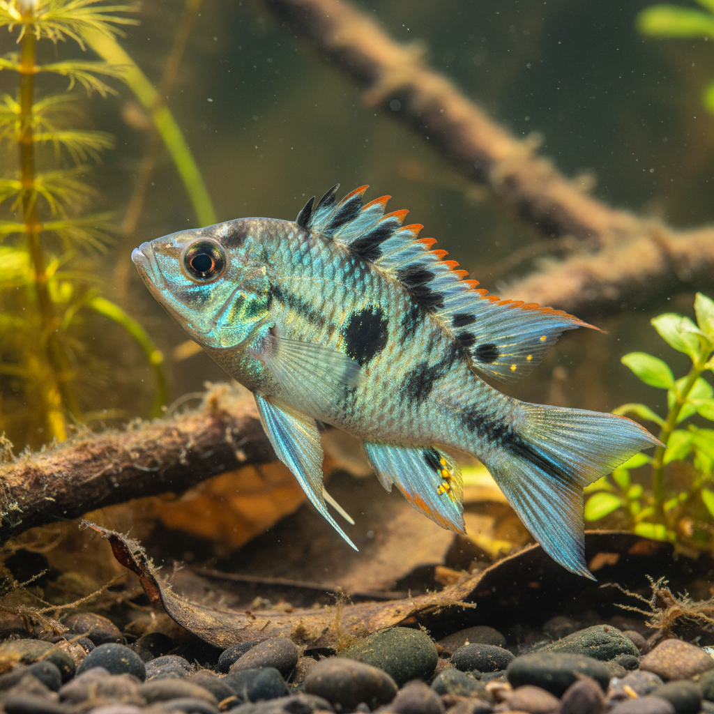 The Inca Dwarf Cichlid (Apistogramma baenschi) is a showstopper among South American dwarfs. Discovered relatively recently (2002), it quickly became a favorite for its dramatic appearance. Males possess an extraordinarily tall, serrated dorsal fin that can be raised like a banner, giving them a fierce and regal profile. Their coloration is equally intense, featuring thick dark vertical bars over a body shimmering with metallic sky-blue and golden-yellow. Females, like most Apistogramma, are smaller and turn a bright, protective lemon-yellow when breeding.