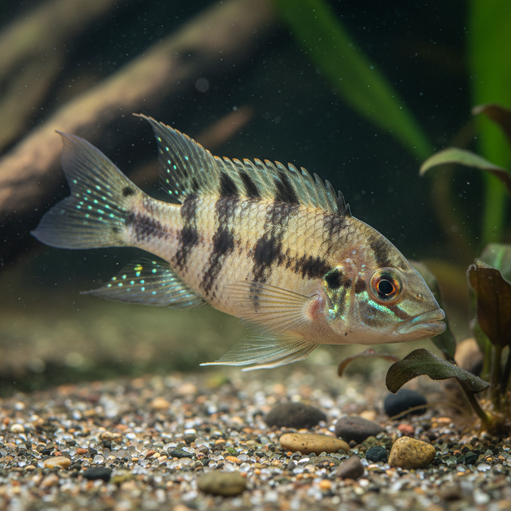 The Inca Stone Cichlid (Tahuantinsuyoa macantzatza) is a fascinating "primitive" mouthbrooder from the Peruvian Amazon. Its name, derived from the Quechua word for the Inca Empire (Tahuantinsuyo), reflects its regal and ancient lineage. It is a subtly beautiful fish, featuring a base color of olive-grey to golden-tan, accented by iridescent blue-green spangling on the scales and a distinct dark line running through the eye. Unlike many flashier cichlids, its charm lies in its intricate patterns and its highly specialized, complex parenting behaviors.