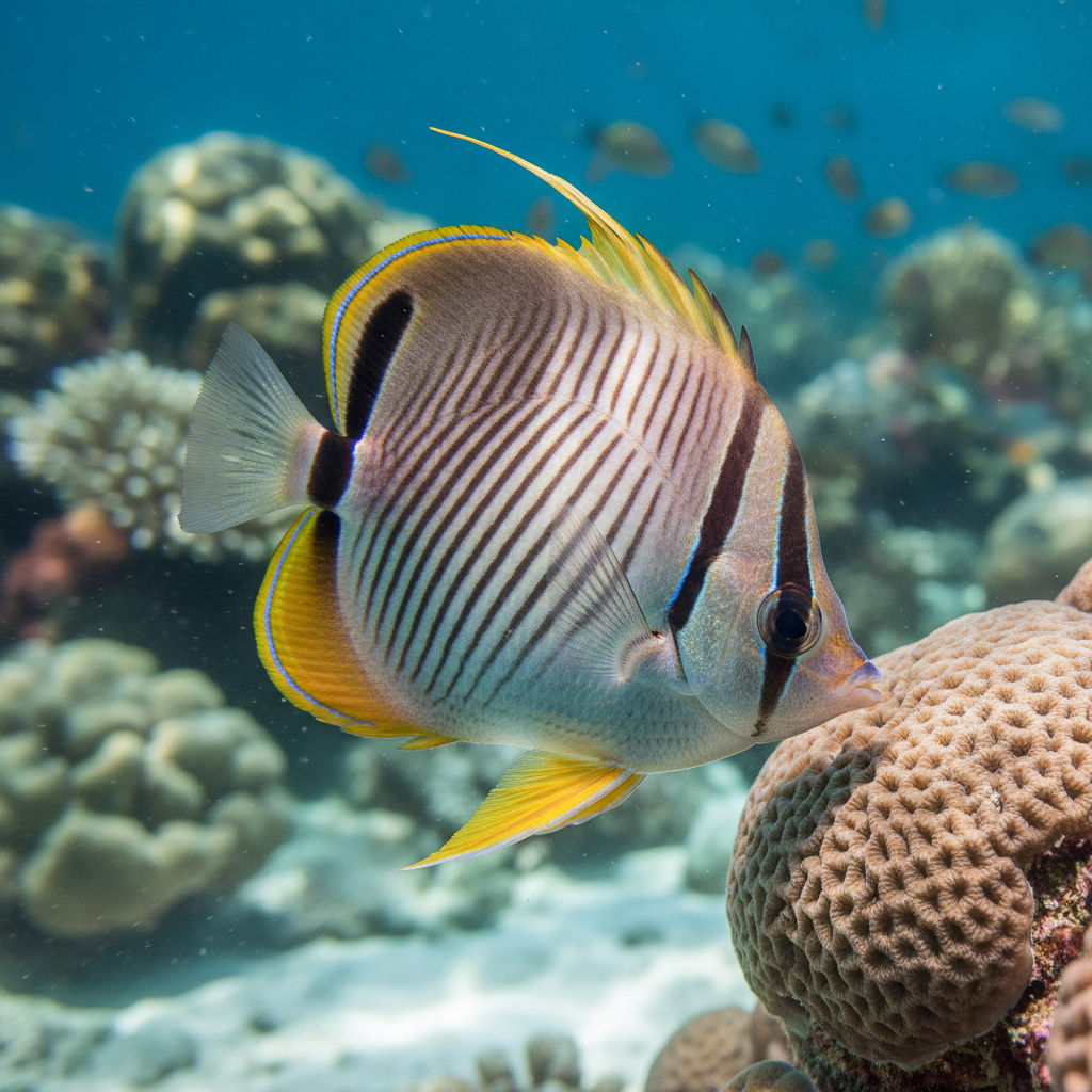 The Indian Vagabond Butterflyfish (Chaetodon decussatus), also known as the Black-veined Butterflyfish, is one of the hardiest and most adaptable species in its family, known for its bold black and white geometric patterns.