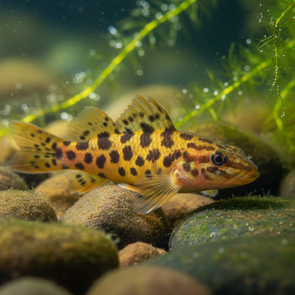 The Irian Golden Nugget Gudgeon (Giuris margaritacea), also known as the Snakehead Gudgeon, is an impressive and often overlooked species in the freshwater hobby. Native to the pristine waterways of New Guinea, it possesses a streamlined, powerful body that hints at its predatory efficiency. Its coloration is a sophisticated blend of deep olive-to-charcoal tones, adorned with a fine network of iridescent gold and silver "nugget" spots along its flanks. As it matures, it develops a deep, high-backed profile and large, expressive eyes, making it a truly majestic resident for larger display aquariums.