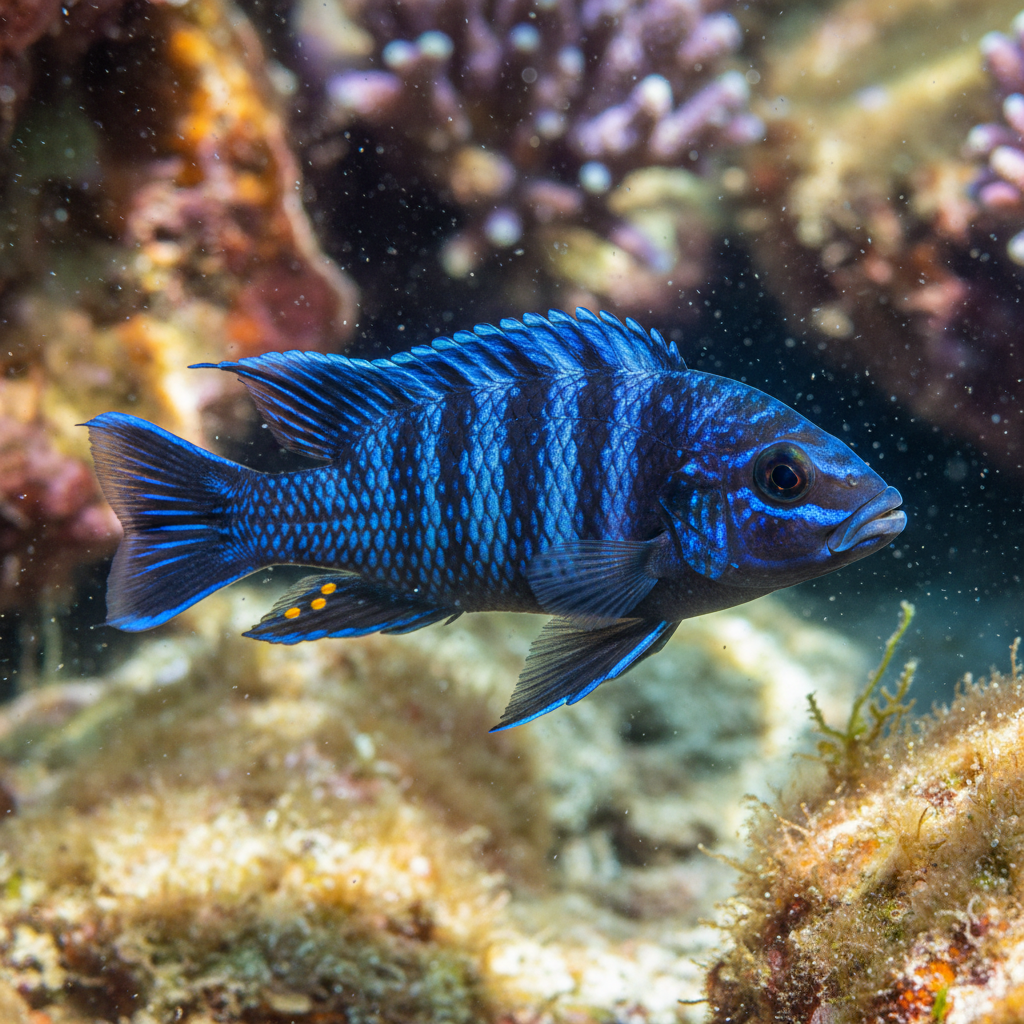 The Johannii Cichlid (Melanochromis johannii), often called the "Electric Blue Johannii," is a masterpiece of natural selection from Lake Malawi. It is famous for its extreme sexual dimorphism: mature males are a deep, midnight blue or black, adorned with two horizontal, glowing electric-blue stripes that run from may the head to the tail. In stark contrast, females and juveniles are a uniform, brilliant orange-yellow. This dramatic difference makes a colony of M. johannii one of the most visually balanced and exciting displays in the rift-lake hobby. Like all mbuna, they are high-energy, territorial, and remarkably intelligent fish that require a specialized "rock-crawler" environment.