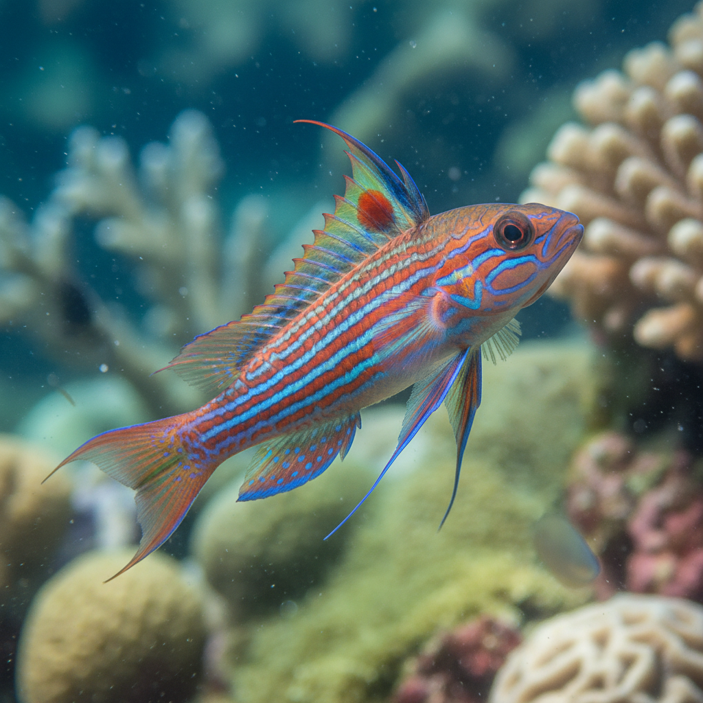 Laboute's Fairy Wrasse (Cirrhilabrus laboutei), often called the Labouti Wrasse, is one of the most structurally and chromatically complex members of the Cirrhilabrus genus. Native to the deep, clear waters of the Coral Sea, it is defined by its extraordinary "maze-like" color pattern. Unlike the solid-colored wrasses, the Labouti features a series of precise, intersecting lines of pink, orange, and blue that resemble stained glass or intricate embroidery. During display, males undergo a dramatic "flashing" behavior where their colors intensify to a neon glow, particularly along their dorsal and anal fins. For the reef enthusiast, Laboute's Fairy Wrasse is a peaceful, kinetic addition that brings a high-end, sophisticated aesthetic to the upper water column.