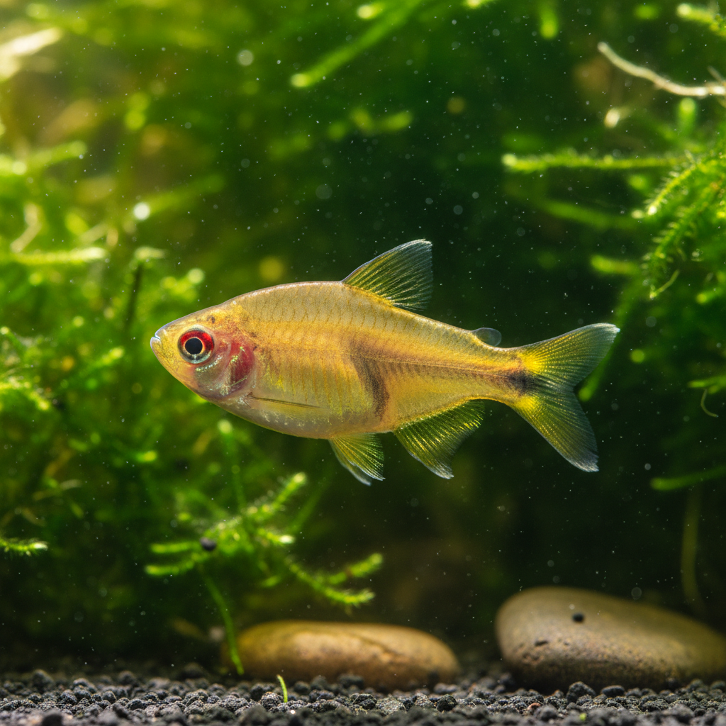 The Lemon Tetra (Hyphessobrycon pulchripinnis) is a translucent masterpiece from the Amazon, defined by its radiant lemon-yellow hue and its startlingly bright, cherry-red eyes.