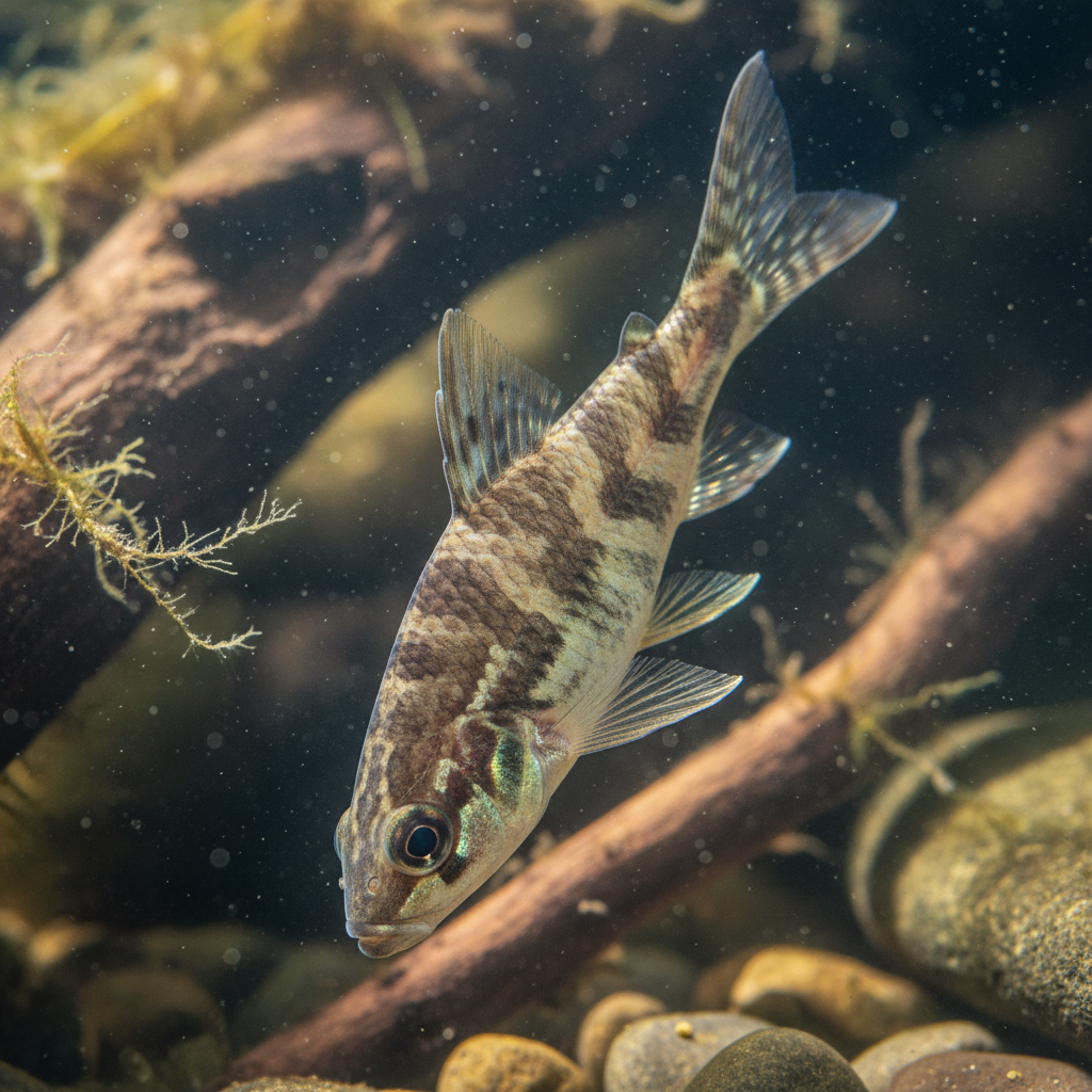 The Marbled Headstander is native to the waters of South America, particularly in the slow-moving rivers and streams of the Amazon Basin, where it is commonly found in Brazil and Peru. This species thrives in blackwater environments, which are characterized by low pH levels and high concentrations of humic acids from decaying leaf litter and organic matter. The Marbled Headstander prefers areas with ample submerged vegetation and driftwood, which provide both shelter and breeding opportunities. These natural settings create an intricate tapestry of habitats, underscoring the significance of replicating similar conditions in captivity to ensure the health and well-being of this species.