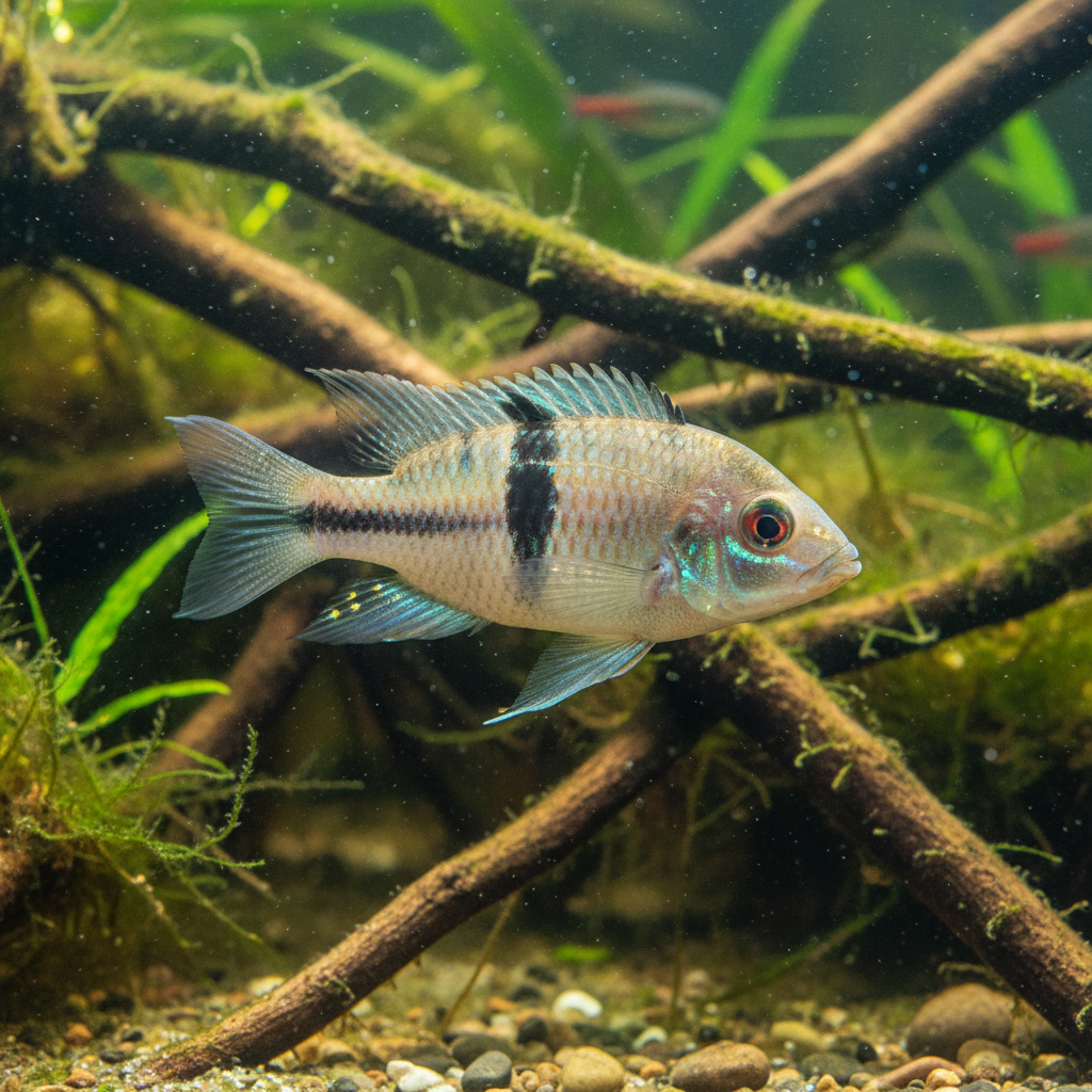 The Maroni Cichlid is indigenous to the waterways of the Amazon Basin in South America, where it thrives in specific ecological conditions. This species typically resides in slow-moving rivers and streams with a prevalence of dense vegetation, providing both shelter and forage. The waters in these regions are often characterized as blackwater, consisting of tannin-stained water with low mineral content and varying pH levels, generally around 5.5 to 7.0. The combination of soft, acidic water and shaded environments from overhanging branches contributes to the unique stress-free habitat that nurtures these fish.