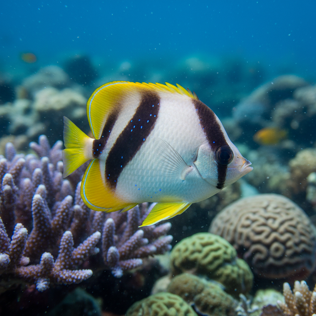 The Marquesas Butterflyfish is native to the warm, tropical waters of the Marquesas Islands in French Polynesia. This species predominantly inhabits coral reef environments where it can be found in shallow lagoons and reef slopes. The ideal living conditions include clear waters rich in coral structures, which provide both shelter and abundant feeding opportunities. Specifically, they thrive in waters that typically range from 24 to 28°C (75 to 82°F), with a salinity closer to that of the ocean, which is about 35 parts per thousand.