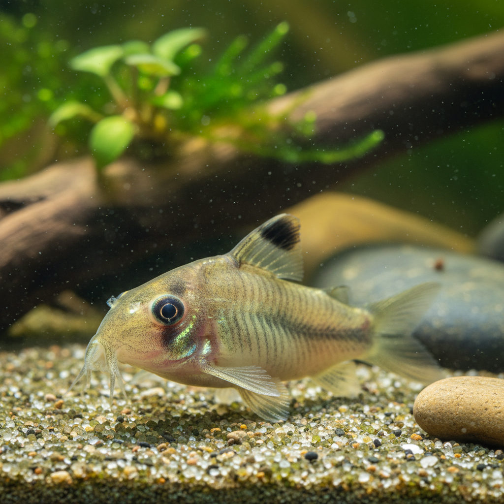 To keep your Masked Corys healthy and thriving, certain water parameters and tank setups are critical. The ideal pH range for these fish is between 6.0 to 7.5, with a temperature maintained between 75°F to 82°F (24°C to 28°C). Additionally, the water hardness should be kept at 2 to 10 dGH, emulating their native softwater environment. Regular water changes and a robust filtration system are essential to maintain water quality and stability.
