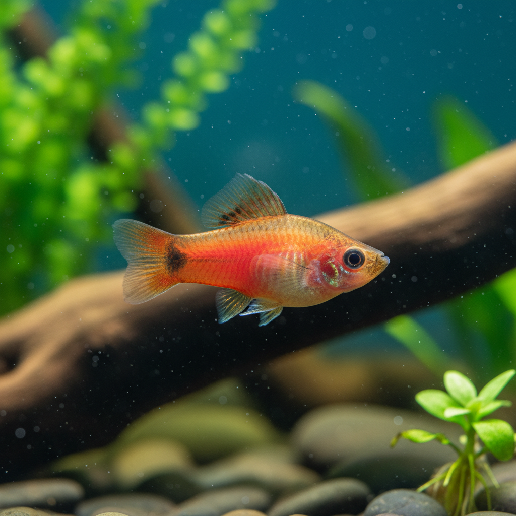 Lighting should be moderate to bright, which helps stimulate plant growth while allowing the vibrant colors of the Mickey Mouse Platy to stand out. Live plants such as Java fern, Anubias, and Hornwort not only enrich the aquarium's look but also improve water quality. Additionally, ensure proper filtration and regular water changes to keep the aquarium environment clean and healthy.