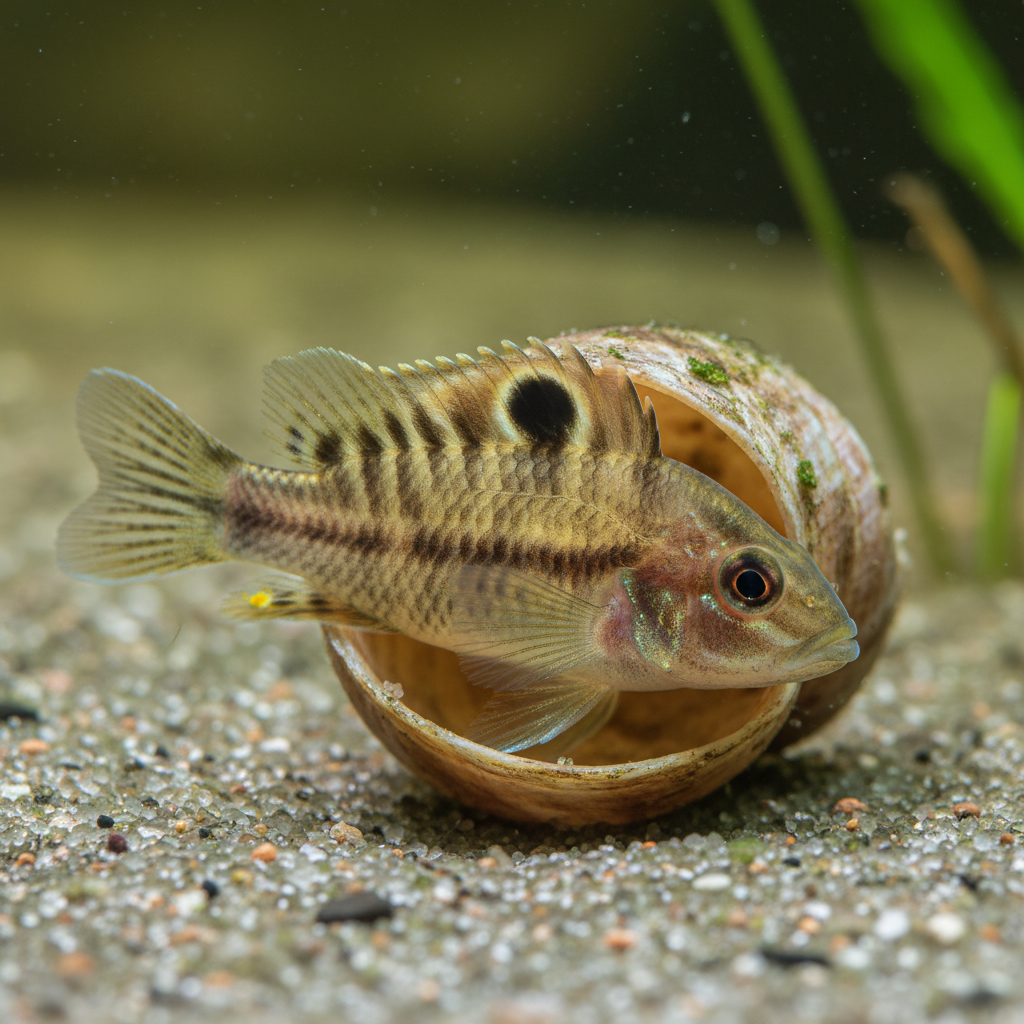 When setting up their tank, opt for a sandy substrate to emulate their natural environment, combined with a few strategically placed shells, such as those from apple snails, to provide hiding spots and breeding sites. Good water circulation and moderate lighting are essential; the lighting should mimic natural conditions to bring out the full coloration of these fish. Some hardy plants may be introduced, though it’s advisable to keep them minimal as Ocellatus Shelldwellers appreciate open swimming areas.