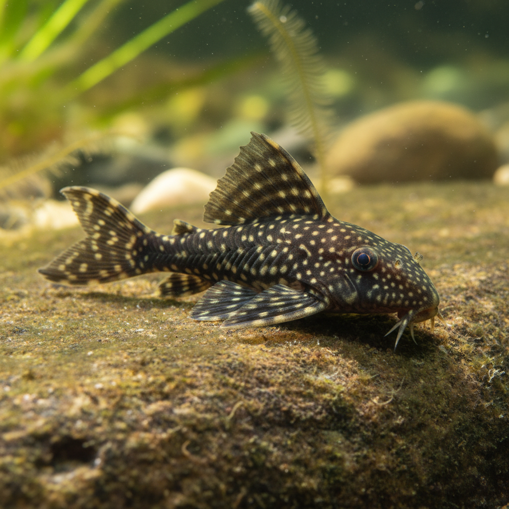 A striking, ink-black dwarf pleco absolutely smothered in enormous white polka dots.
