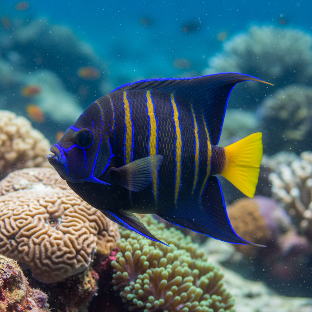 The Passer Angelfish hails from the warm waters of the Indian and Pacific Oceans, particularly prevalent around coral reefs of Eastern Africa, the Red Sea, and the Galápagos Islands. These ecosystems feature a dynamic mix of clear waters and rich coral formations, providing the fish with ample cover and abundant food sources. Typically, the Passer Angelfish is found in depths from 5 to 50 meters, where it thrives in both sheltered areas and more open spaces among the thrilling topography of coral reefs.