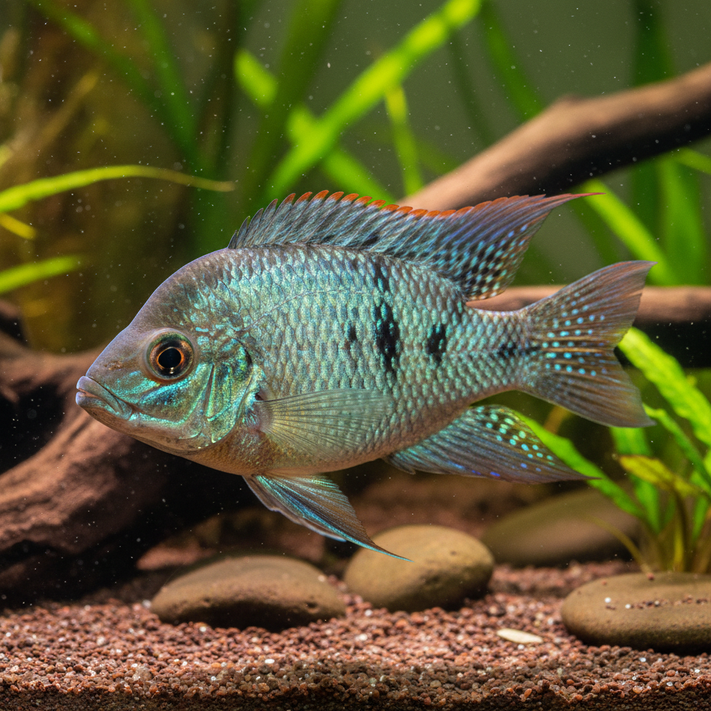 Geographically, the Pearl Cichlid can be found in various water bodies across Brazil, where it thrives in dynamic ecosystems. These fish are specifically well-suited for environments with ample hiding spots, substrates conducive to digging (such as sand), and gentle water flow. Their natural behaviors center around foraging for food along the substrate, providing insights into their dietary preferences which can be effectively leveraged in a captive setting to mimic their native habitats.