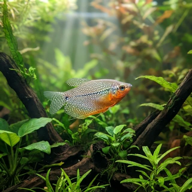 A larger, elegant gourami covered in pearly white dots. Known for its beauty, hardiness, and surprisingly gentle nature despite its size.
