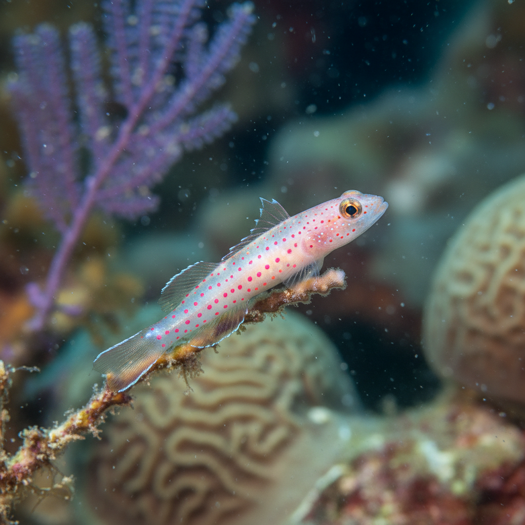 The Pinkspot Goby is native to the warm waters of the Indo-Pacific region, particularly found in coral reefs and sandy substrates throughout the Philippines, Indonesia, and surrounding areas. It thrives in shallow environments where it can easily access food and evade predators. Typically residing in coral-rich areas and lagoon environments, this goby prefers clear, well-oxygenated waters that support its lifestyle. As a species that often dwells close to the substrate, it is important for aquarists to replicate its natural habitat to ensure its health and well-being in captivity.