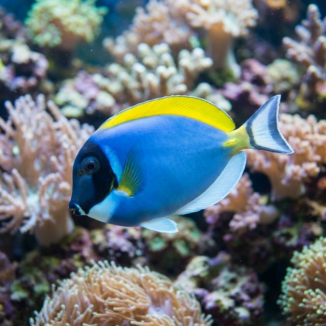 The Powder Blue Tang, scientifically known as Acanthurus leucosternon, is an iconic marine fish that captivates aquarists with its striking appearance and vibrant color. Resplendent in a brilliant blue hue, this species features a distinctive yellow tail and a unique pattern of white and black markings on its face. These visual characteristics make the Powder Blue Tang a sought-after addition to saltwater aquariums, where its dynamic colors and graceful movement can enhance the aesthetic appeal of any tank. Beyond its beauty, the Powder Blue Tang holds significant value in the aquarium hobby, often serving as both a centerpiece fish and a representative of the surgeonfish family (Acanthuridae), which is renowned for its diversity and adaptability.
