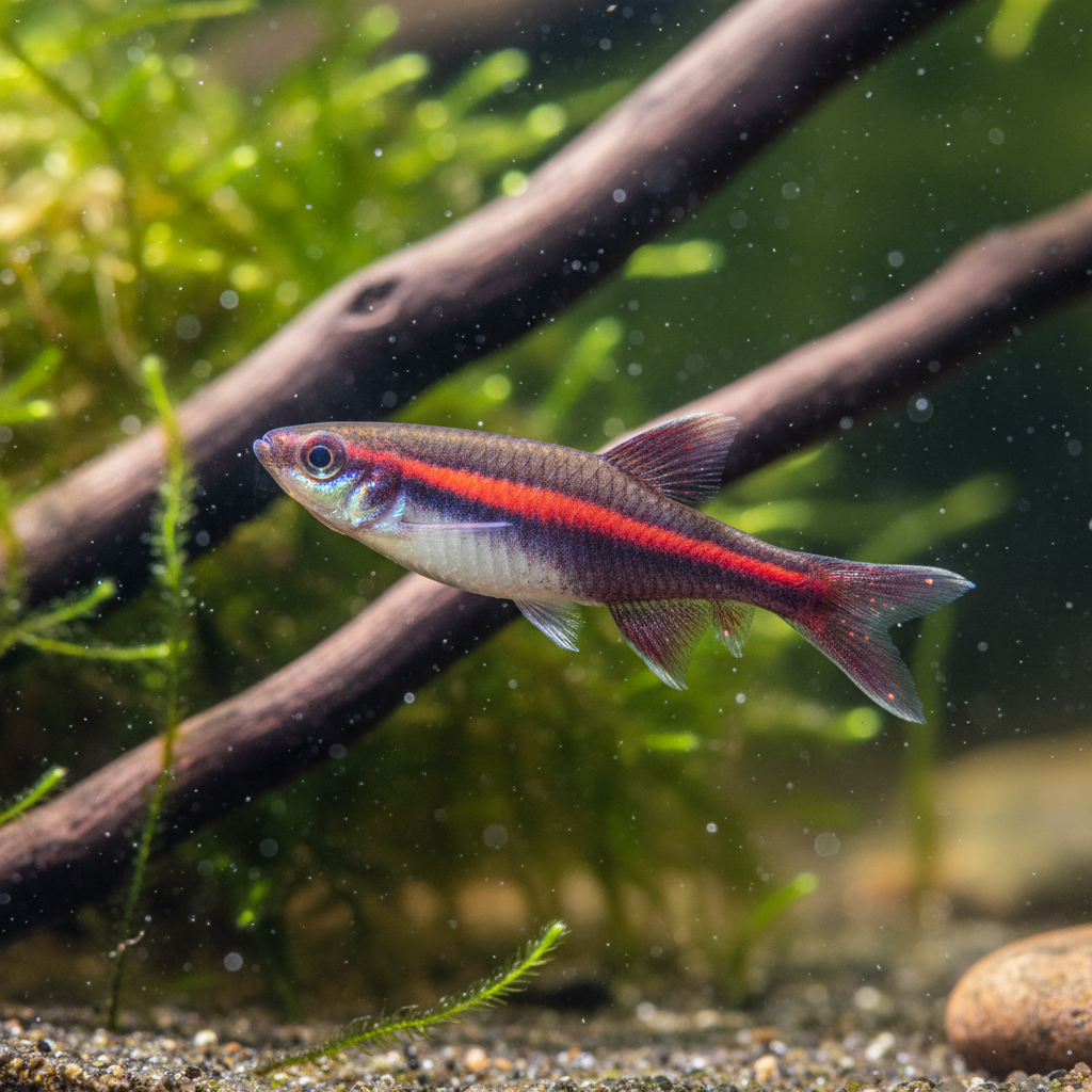 A legendary nano fish where mature males achieve an incredibly intense, glowing magenta-purple coloration over their entire body.