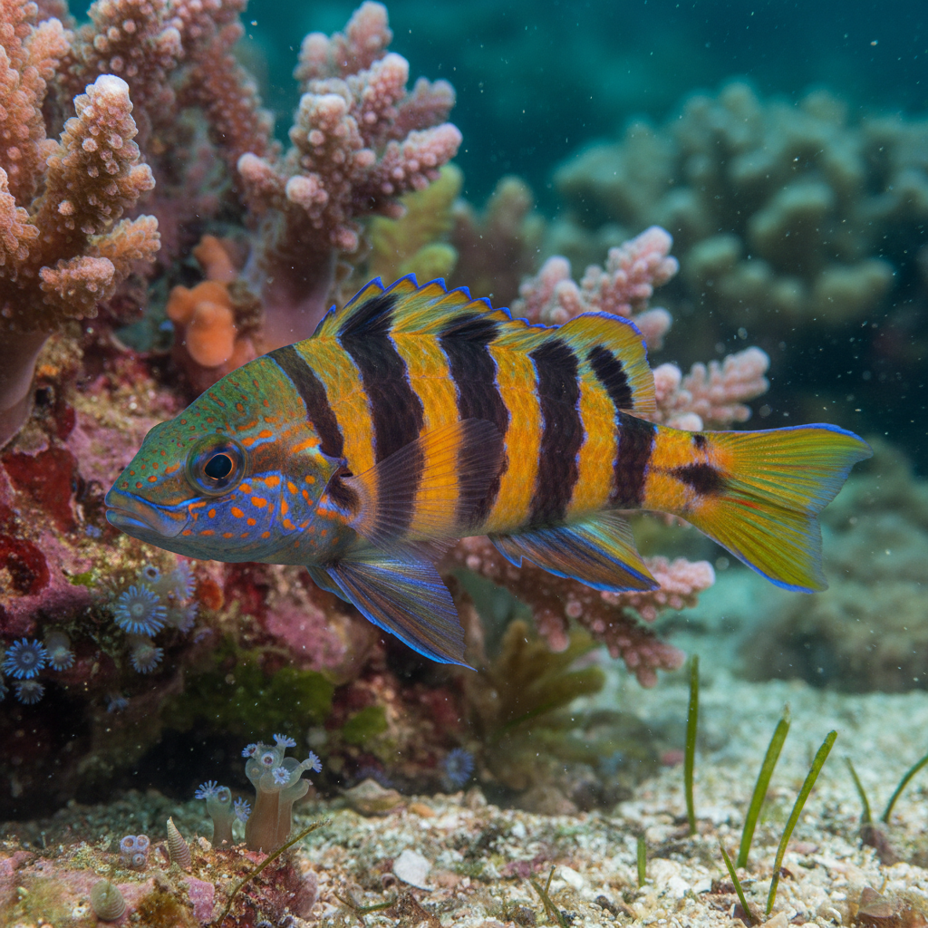 In its natural environment, the Pyjama Wrasse is often found in association with coral structures, where it can forage for tiny crustaceans, worms, and other bottom-dwelling invertebrates. Their penchant for burrowing into the substrate allows them to evade predators while simultaneously searching for food, displaying their adaptability and resourcefulness. Such a diverse habitat further enhances the wrasse's ecological importance, contributing to the overall health and balance of coral reef ecosystems.