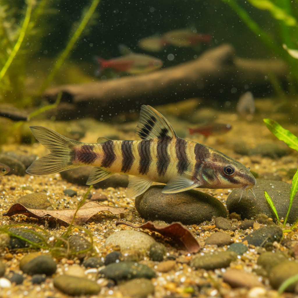 A fast, heavily banded schooling loach known for its striking gold and black tiger-stripes and voracious appetite for snails.