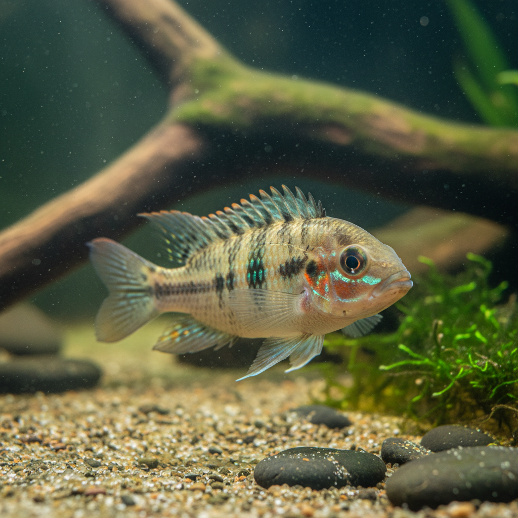 A deeply peaceful, surprisingly gentle South American cichlid featuring stunning red operculum markings.