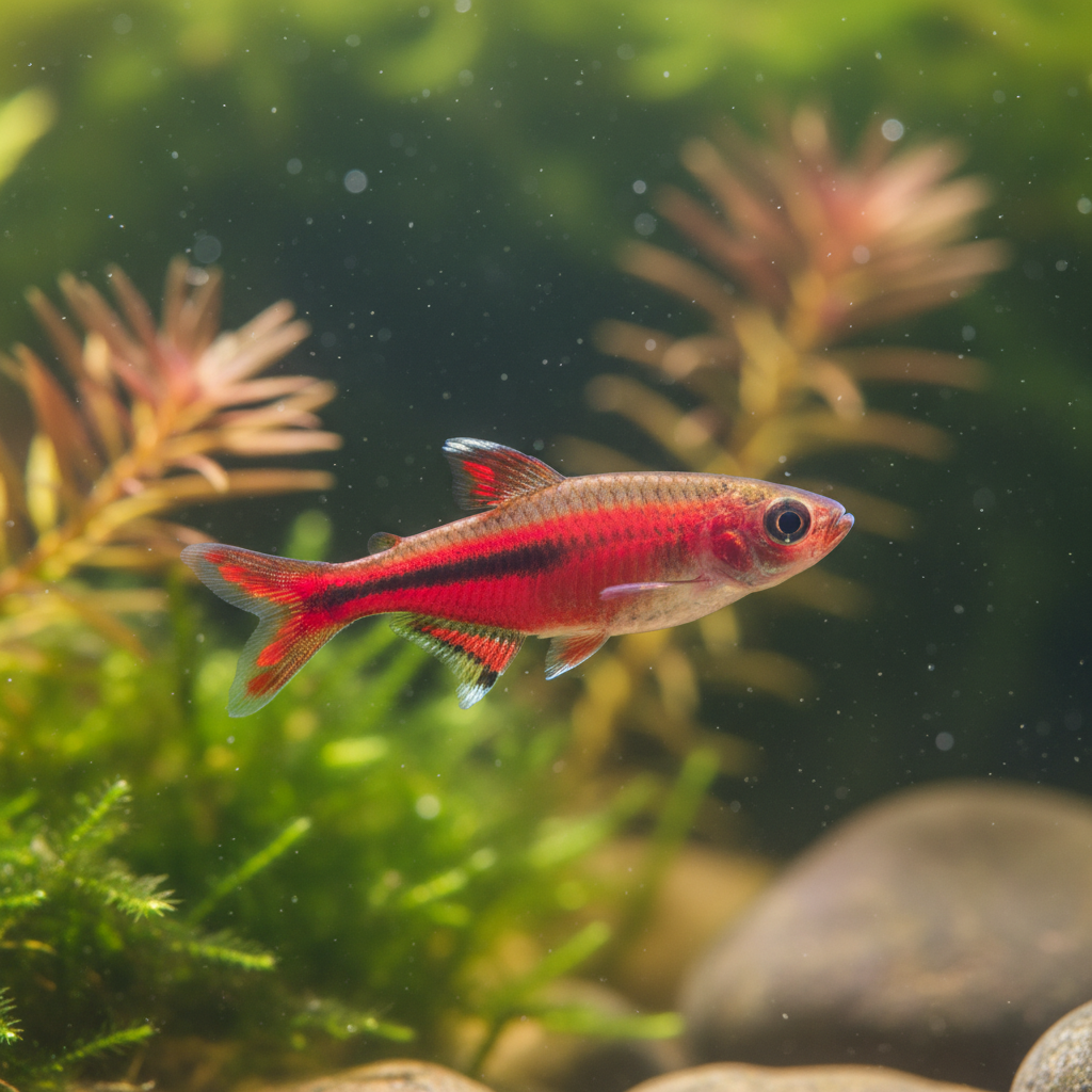An incredibly rare, stunningly bright schooling cyprinid featuring an intense ruby-red horizontal stripe over a gold body.