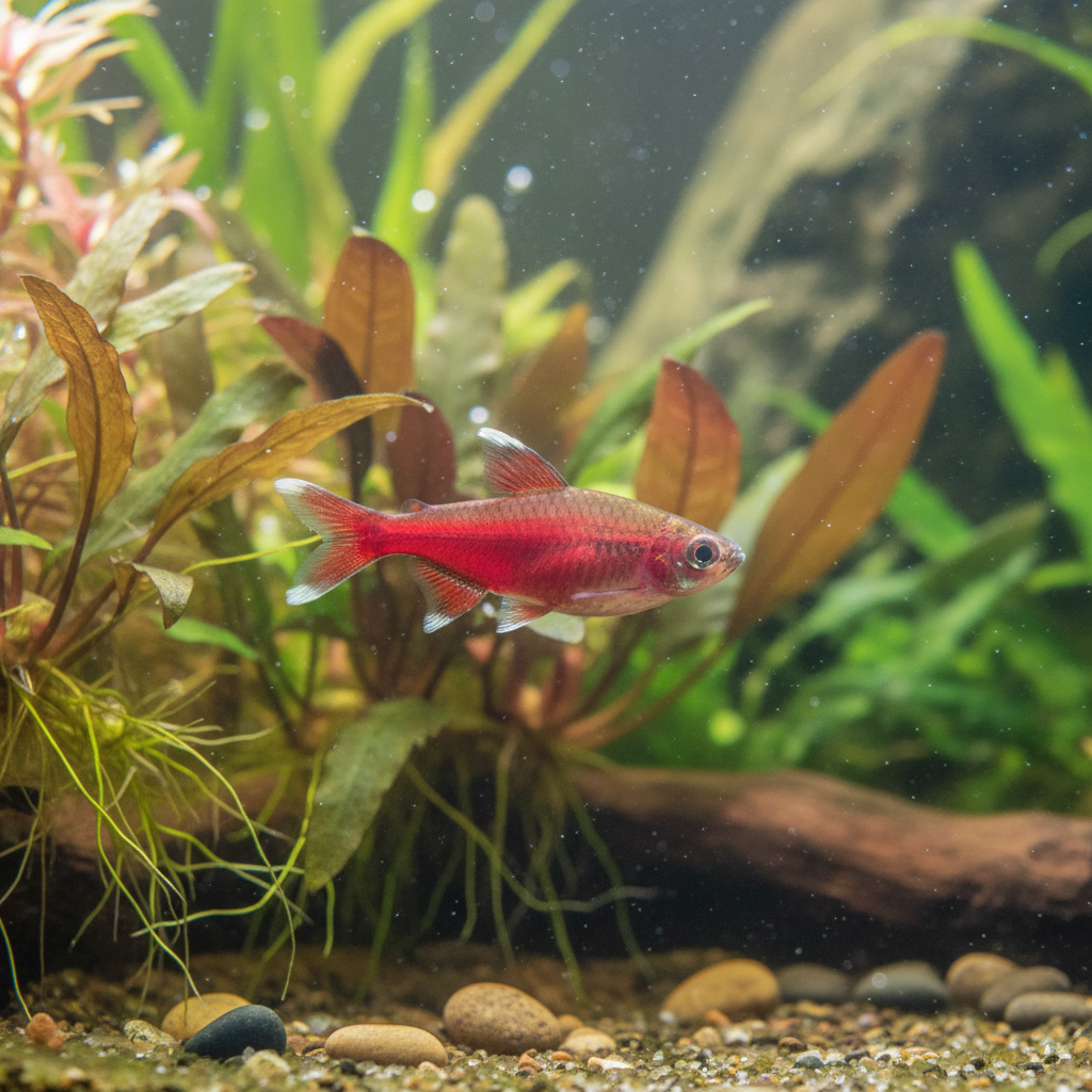 A spectacularly vivid, deep-bodied tetra that attains a solid, glowing, translucent dark-red coloration across its entire body.