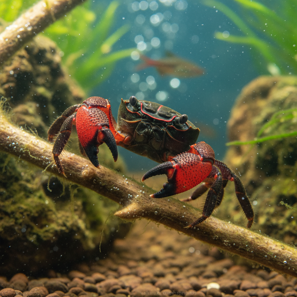Choosing compatible tank mates for the Red-clawed Crab is crucial for a harmonious aquarium. Suitable companions include peaceful fish species such as guppies, neon tetras, rasboras, and some smaller barbs. Invertebrates like snails and shrimp (specifically larger species like Amano shrimp) may also coexist well, provided the crabs are not overly aggressive during territorial disputes.