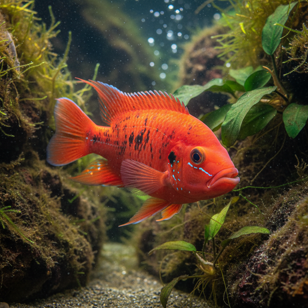 The Red Devil, scientifically known as Amphilophus labiatus, is a captivating freshwater cichlid that is a popular choice among both novice and experienced aquarium enthusiasts. With its vibrant orange to red coloration, accented with dark spots and a distinctively shaped body, this fish not only serves as a striking focal point in any aquatic setting but also displays a unique personality. Known for its aggressive nature and strong territorial instincts, the Red Devil has earned a reputation as a challenging yet rewarding species to keep in the home aquarium, embodying the thrill of cichlid keeping.
