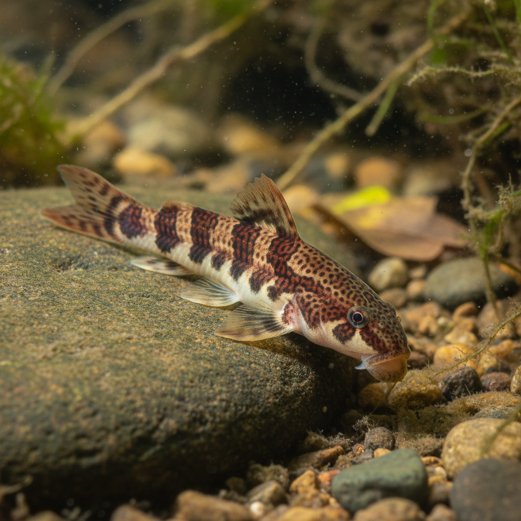 A deeply patterned, highly specialized hillstream loach resembling a gecko that clings powerfully to rocks in torrential rapids.
