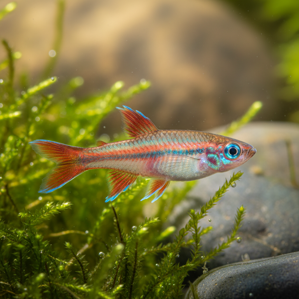 A tiny, breathtakingly colorful Indonesian schooling fish featuring piercing blue eyes and a glowing red-orange body.