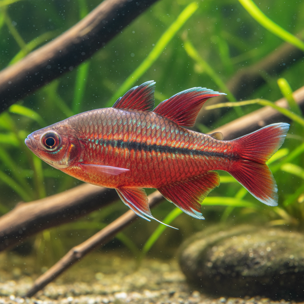 The Red Rainbowfish, scientifically known as Glossolepis incisus, is a vibrant freshwater species native to the lush waters of Papua New Guinea. Known for their striking colors, these fish exhibit a stunning array of shades ranging from brilliant reds and oranges to shimmering blues, particularly in males, which flash their colors during mating displays. The visual appeal of the Red Rainbowfish makes it a favorite among aquarists seeking to add dynamic color to their tanks. Their unique shape and lively swimming patterns further enhance their charm, captivating both novice and experienced fish keepers alike.