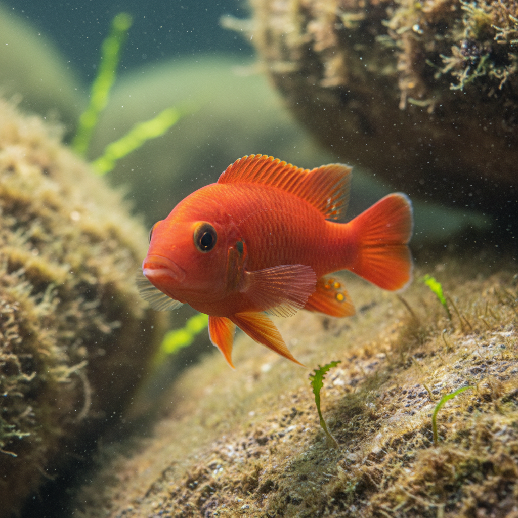 In terms of ecological context, Metriaclima esterae 'Red' thrives in areas with abundant algae and detritus, playing a role in controlling algal growth within their natural habitat. They are often observed grazing on these food sources, which also serves to highlight the importance of creating a well-established tank environment that simulates their native conditions. The knowledge of their natural habitat informs aquarium setups that prioritize water quality and a similar landscape to promote their health and wellbeing.