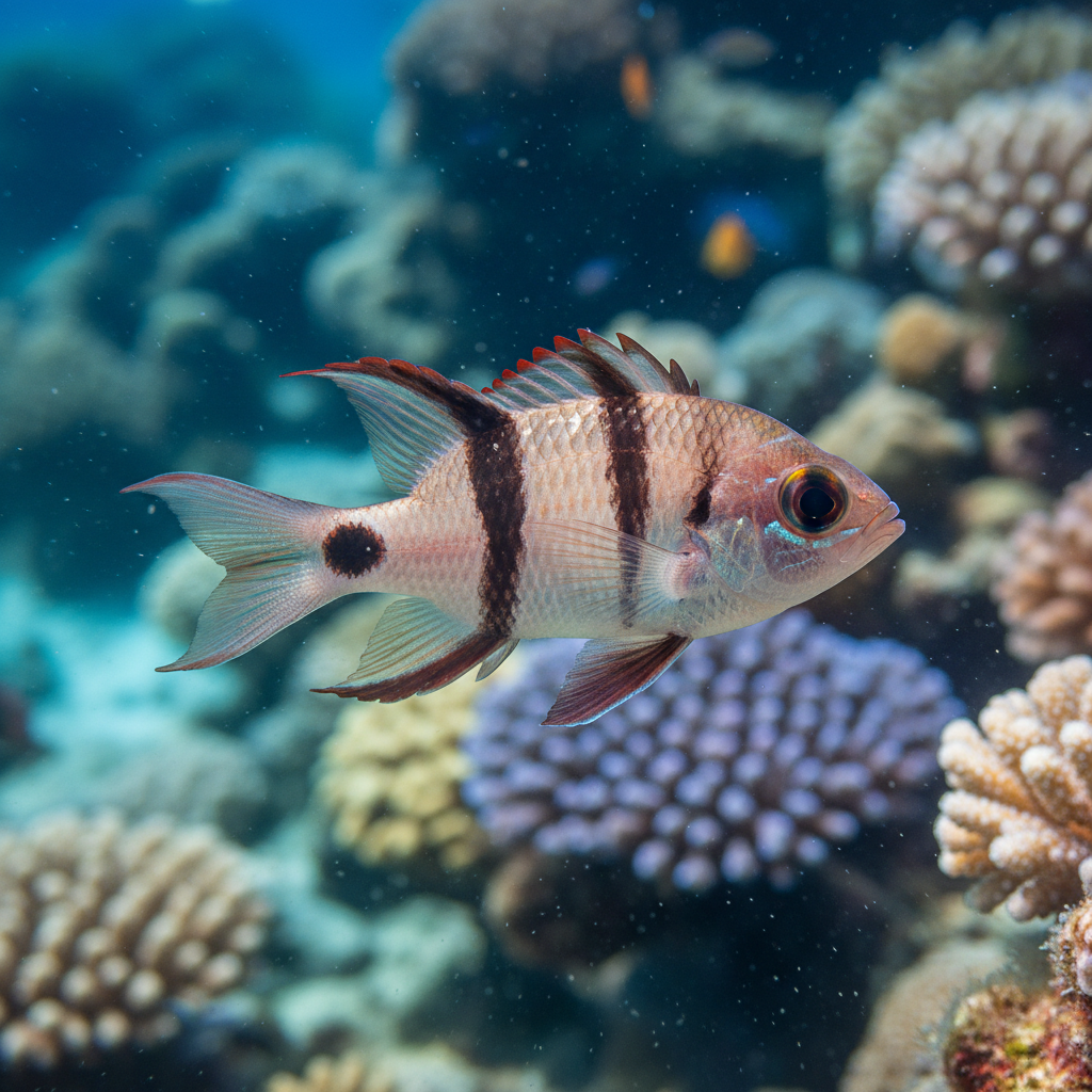 The Red-spot Cardinalfish, known scientifically as Cheilodipterus novemstriatus, is a captivating freshwater fish that has garnered attention in the aquarium hobby for its vibrant colors and unique characteristics. This species boasts a striking body adorned with distinct red spots along its silhouette, making it a visually appealing addition to various aquascapes. The Red-spot Cardinalfish grows to an average length of around 3 inches, and its coloration can vary from a shimmering silver-blue to deeper hues, depending on lighting and environment. Beyond its beauty, the Red-spot Cardinalfish plays a significant role in the aquatic ecosystem, often serving as a bioindicator of environmental health in its natural habitat.