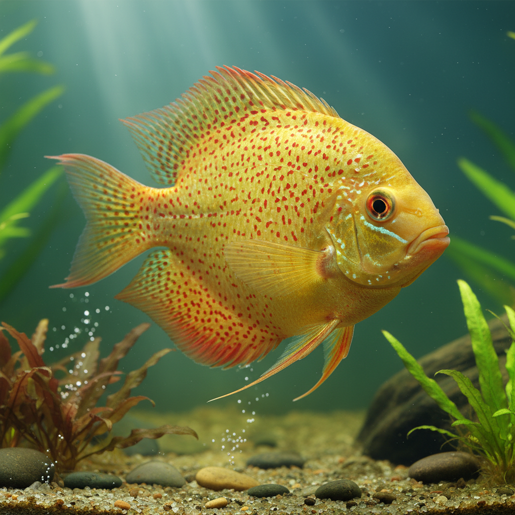 In the aquarium hobby, the Red-spotted Gold Severum holds significant importance not only for its aesthetic appeal but also for its interactive qualities. This species showcases a fascinating combination of intelligence and curiosity, often readily interacting with their owners and exploring their surroundings. Additionally, its relatively peaceful disposition in community tanks—when compared to its more aggressive cichlid counterparts—renders it suitable for many aquarists. As a result, the Red-spotted Gold Severum has become an increasingly sought-after species, appealing to both novices and experienced aquarists alike.