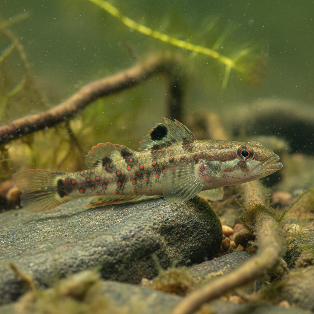 The Red-spotted River Goby is native to the temperate rivers and streams of eastern Asia, particularly prevalent in Japan, Korea, and parts of China. This species favors slow-moving waterways that are often characterized by a soft substrate and abundant hiding spots, such as rocks and vegetation. The environment they inhabit tends to be a mix of clear and slightly tinted waters due to the presence of organic matter and leaf litter, which contributes to the dim lighting conditions of their natural habitats.