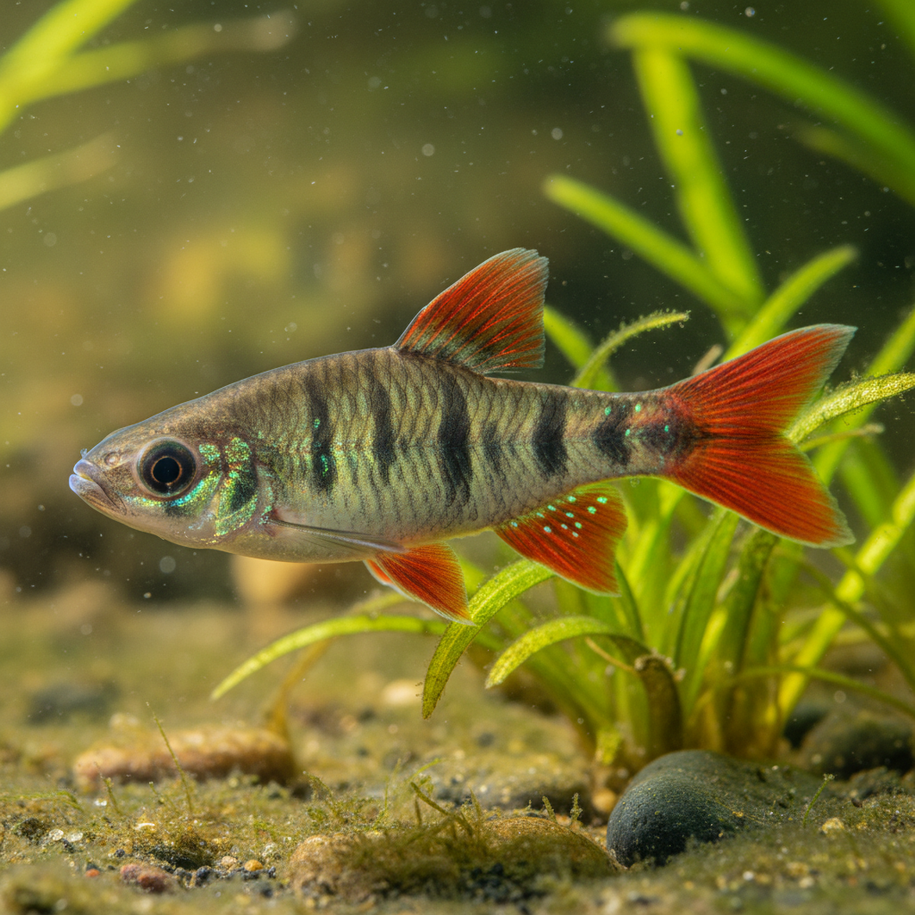 In a community setup, the Red-tailed Goodeid often occupies the mid to upper levels of the tank. It’s not uncommon for them to use all vertical spaces available, darting between plants and decorations. Their sociable nature allows them to interact well with other compatible species, leading to an engaging display in the aquarium.
