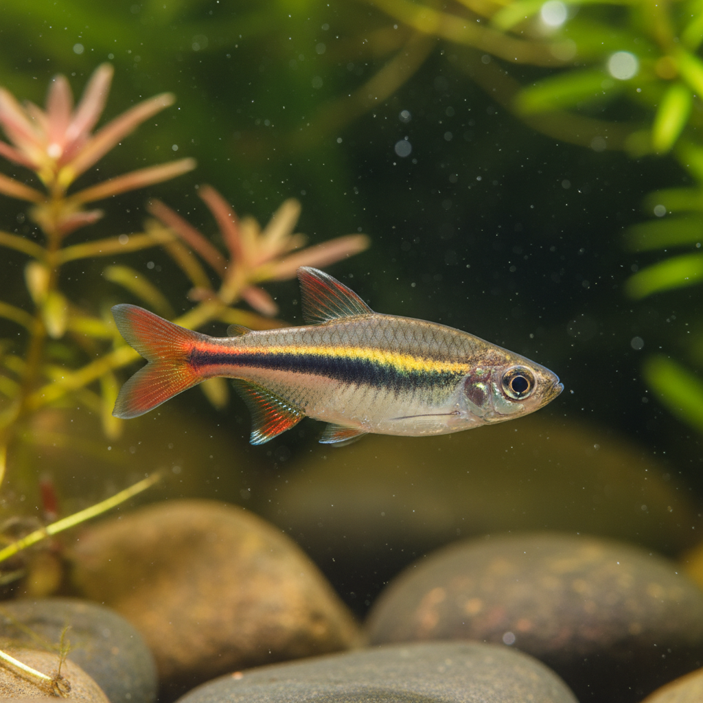 A spectacular, high-contrast schooling cyprinid featuring a jet-black lateral line tipped by a brilliant red-orange tail.