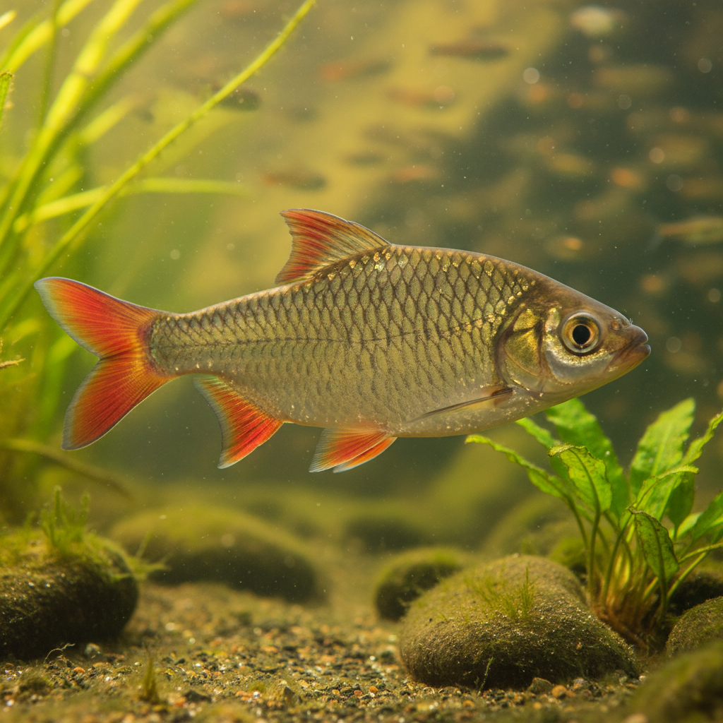 The natural habitat of the Red-tailed Tinfoil Barb primarily spans the rivers and floodplains of Southeast Asia, particularly countries like Indonesia, Malaysia, and Thailand. This fish inhabits freshwater systems, where it typically prefers clear or slightly stained waters with slow to moderate currents. The ecological context includes densely vegetated areas in rivers and lakes, where they find ample food sources and breeding grounds. This natural environment underscores their need for similar conditions in captivity for optimal growth and well-being.