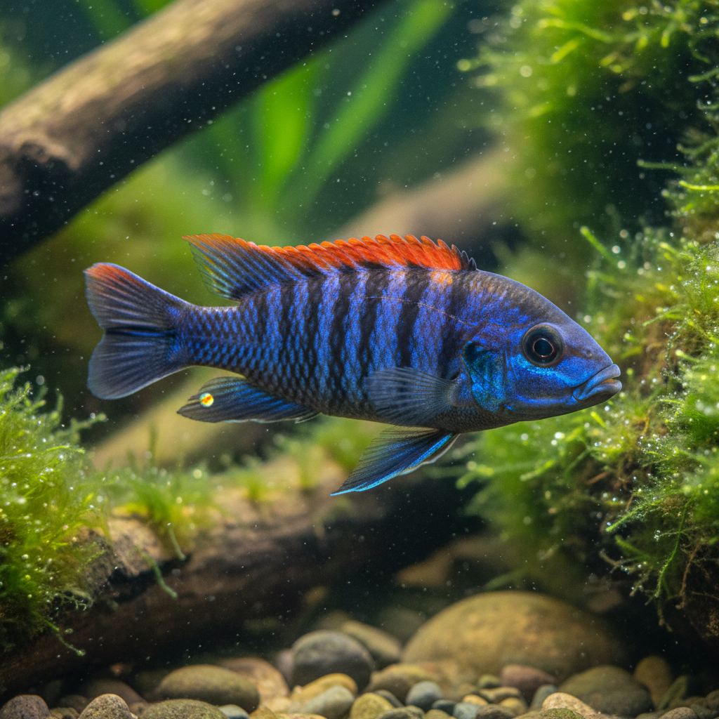 A spectacular, aggressive dwarf Mbuna cichlid featuring fiery orange-red dorsal fins set against a zebra-striped blue body.