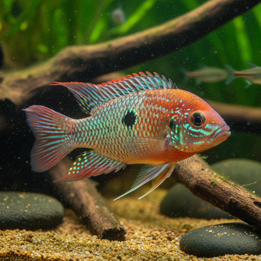 Arguably the most beautiful, peaceful South American cichlid featuring a shimmering body and an intensely solid red-orange "crown."