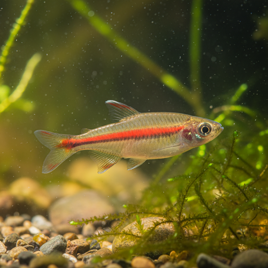 A hyper-slender, fast-moving cyprinid from Southeast Asian peat swamps, glowing with a solid neon red stripe.