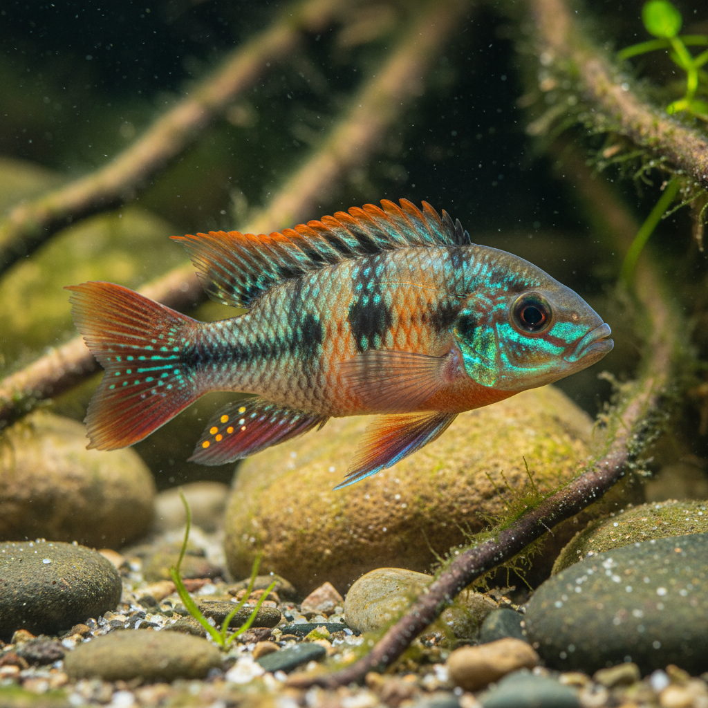 In their wild environment, Rock Kribensis Cichlids thrive in a community of diverse flora and fauna, where they find shelter among aquatic plants and rocks. This natural context highlights the need for aquarists to provide suitable environmental parameters in captivity, such as stability in water chemistry and adequate hiding spots, to mimic their native ecosystem and promote their well-being.