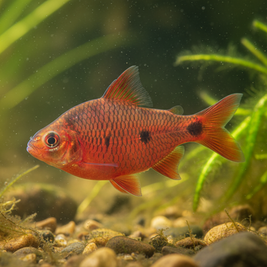 A hardy, metallic-pink barb that brings constant energy to the aquarium. One of the most durable and active community fish available.