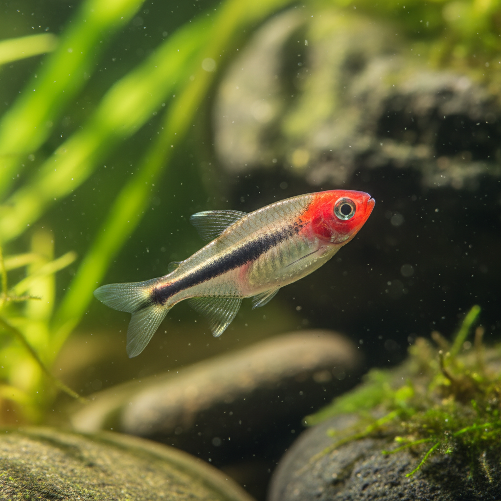 The tightest-schooling tetra in the hobby. Known for its bright red nose and striped tail, the rummy nose is the quintessential schooling fish.