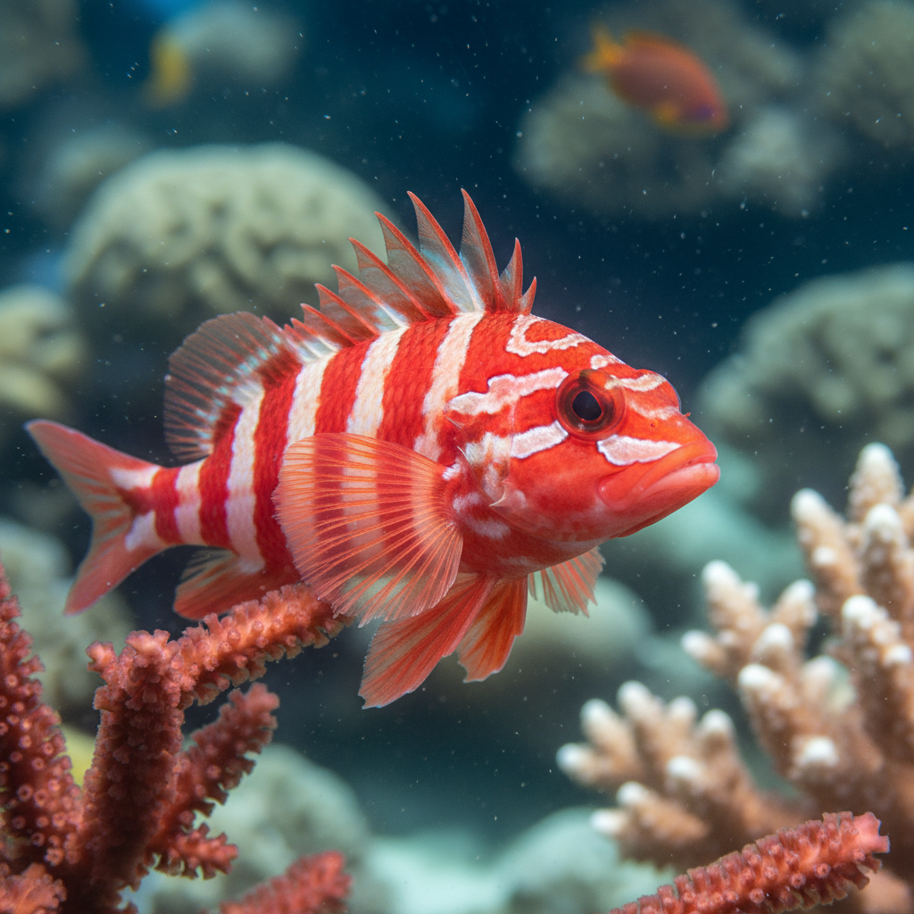 The Scarlet Hawkfish is typically found in the western Pacific, primarily around coral reefs and rocky environments in countries like Indonesia, the Philippines, and the Great Barrier Reef in Australia. Preferring shallow waters, this species generally inhabits depths ranging from 3 to 30 meters (about 10 to 100 feet), demonstrating a strong association with complex reef structures. The natural habitat features clear, warm waters where light penetration supports the growth of coral, providing ample hiding spots and feeding grounds for the Scarlet Hawkfish.