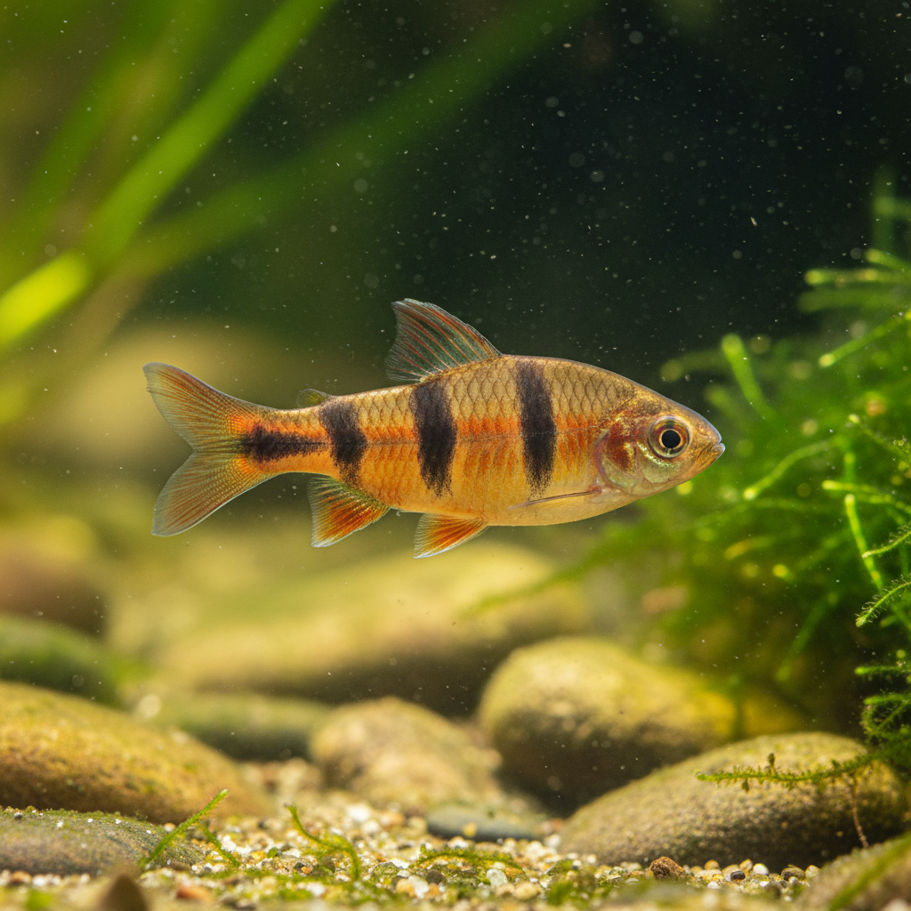 A deeply peaceful, entirely docile alternative to the Tiger Barb, featuring six bold black stripes on a glowing orange/gold body.