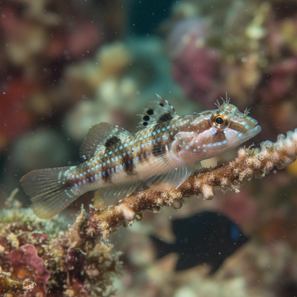 The Spangled Mangrove Goby, scientifically known as Mugilogobius paludis, is a captivating species that has gained popularity among aquarium enthusiasts due to its unique appearance and fascinating behaviors. This small fish, typically reaching around 3 to 4 inches in length, showcases a vibrant pattern of iridescent spots against a pale background, making it a visually appealing addition to any aquatic setup. The intricate speckling resembles twinkling stars against a soft canvas, providing constant intrigue for viewers. Its beautiful coloration is not only a feast for the eyes but also acts as a natural camouflage in its native habitat, allowing it to blend seamlessly among the silty substrates and submerged roots of mangrove ecosystems.