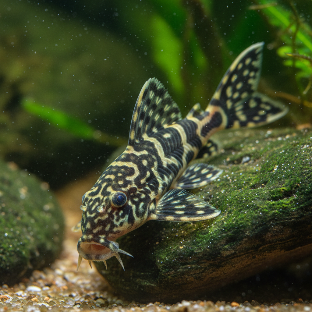 The Spot-tailed Clown Plec is native to the blackwater rivers and streams of the Amazon Basin in South America, particularly found in regions of Brazil and Peru. These habitats are characterized by their soft, acidic waters rich in organic material, which contribute to the dark coloration of the water. The dense vegetation and leaf litter that abound in these environments provide both shelter and a natural source of food for the Spot-tailed Clown Plec, as they are known to graze on algae and detritus found on submerged surfaces. This species thrives in areas with slow-moving water and plenty of hiding spots, highlighting the importance of replicating such environmental elements in captivity to ensure their health and well-being.